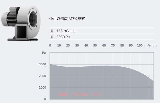 zui高 115 m³/min 和 3050 Pa。 由钢或不锈钢制成的外壳,由镀锌钢板或不锈钢制成的、向前弯曲的鼓形滚筒。 对于不锈钢规格: Niro 轴和zui高的耐腐蚀性。 可变的接口可能性。